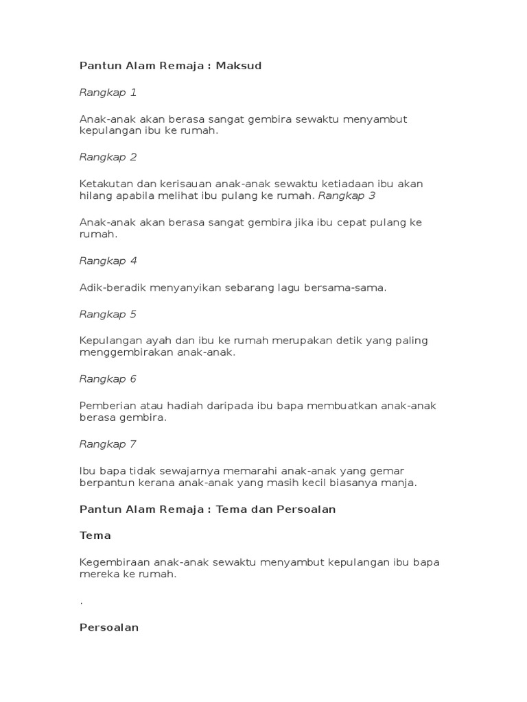 Pantun Alam Remaja Maksud Rangkap 1 Anak-anak akan berasa sangat gembira sewaktu menyambut kepulangan ibu ke rumah. Persoalan a Tanggungjawab ibu bapa ialah memberikan kasih sayang.